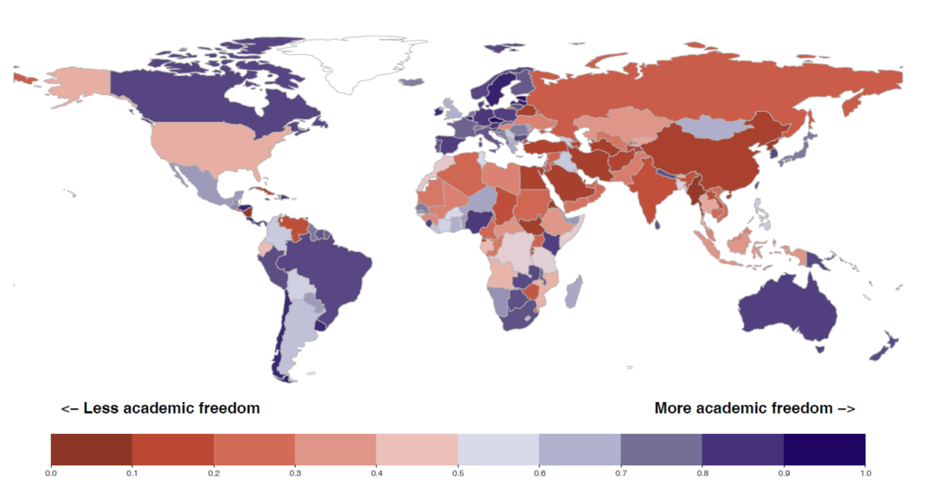 Institutional autonomy is essential for safeguarding academic freedom. It is comparatively stable world-wide, with notable exceptions in autocratizing democracies. This year’s Academic Freedom Index (AFI) report, based on a collaborative project between scholars at Friedrich-Alexander-Universität Erlangen-Nürnberg (FAU) and the Varieties of Democracy (V-Dem) Institute at the University of Gothenburg, provides an overview of the global state of academic freedom. It presents data that demonstrate a correlation between universities’ institutional autonomy and individual scholars’ freedom to research and teach. It also analyses the dramatic decline of university autonomy in the United States of America from a comparative perspective.